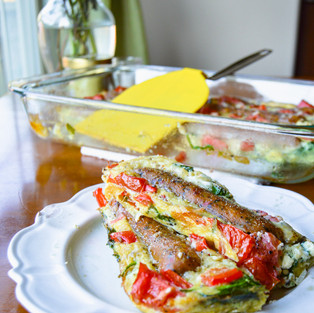 • In a large bowl, crack and beat the 10 eggs. • Pour over veggies & Sausage • Bake at 350 degrees for 30 minutes or until casserole turns golden on the edges. • Slice into 8 equal pieces I served this with pan fried potatoes for the kids & Mat. For my Mindfully Nourished crew you can use this with the potatoes for breakfast, lunch or snack. Skip the potatoes for supper. ❤️